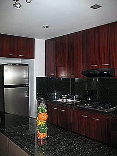 This large, nicely furnished, Medellin apartment, 100 sq meters, (almost 1,100 sq feet) also boasts spacious living and dining areas, fully equipped kitchen, outdoor balcony off the living room, and a separate laundry room. You will find upgraded marble tile flooring throughout and very modern kitchen cabinets with both electric and gas burners on the stove.